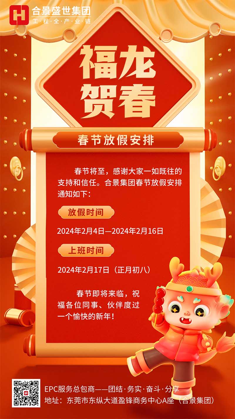 龍年行大運,喜迎新篇章。2024年新春佳節(jié)將至,根據(jù)國家節(jié)假日放假規(guī)定,結合我司實際情況,決定2024年春節(jié)放假安排如下: